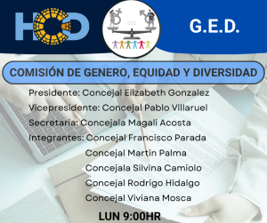 LUNES 18:00 HRS Presidente: Concejal Pablo Cabrera (Bloque Partido Justicialista) Vicepresidente: Concejal Elizabeth Gonzalez (Bloque Unión Mendocina) Secretaria: Concrejala Magali Acosta (Bloque Partido Justicialista ) Integrantes: Concejal Viviana