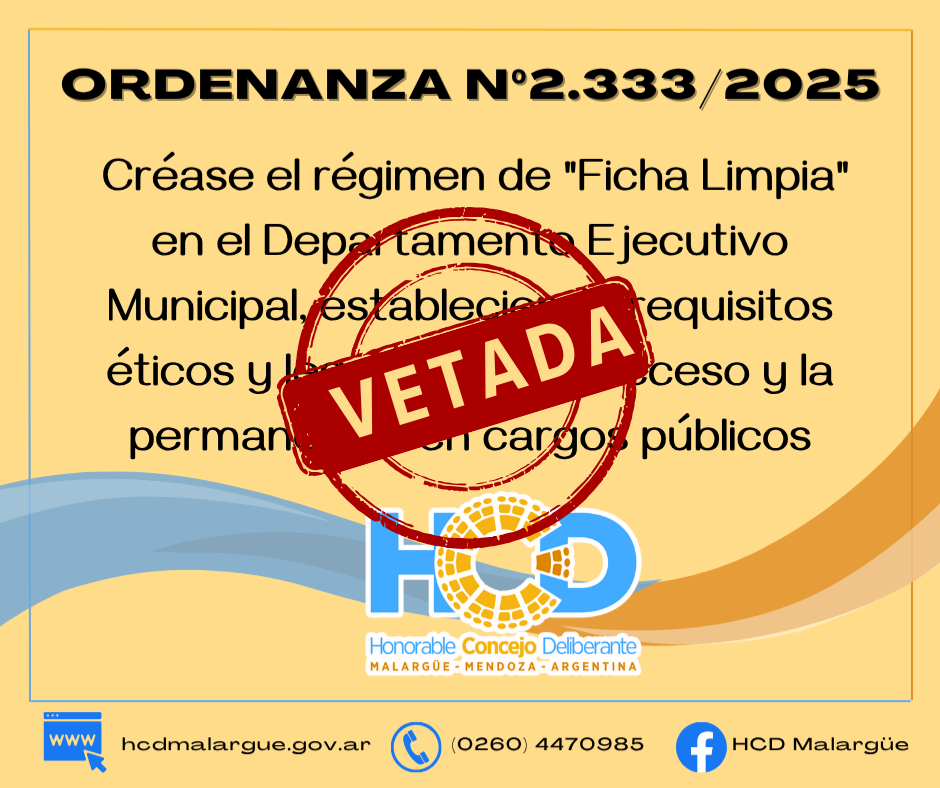El Honorable Concejo Deliberante de Malargüe sancionó la Ordenanza N° 2.333/2.025, que establece el régimen de Ficha Limpia en el ámbito del Departamento Ejecutivo Municipal, con el fin de promover mayores estándares de ética, integridad y transparencia en la función pública. Vetado los Art 6 y 9 por Decreto N° 727/2025.